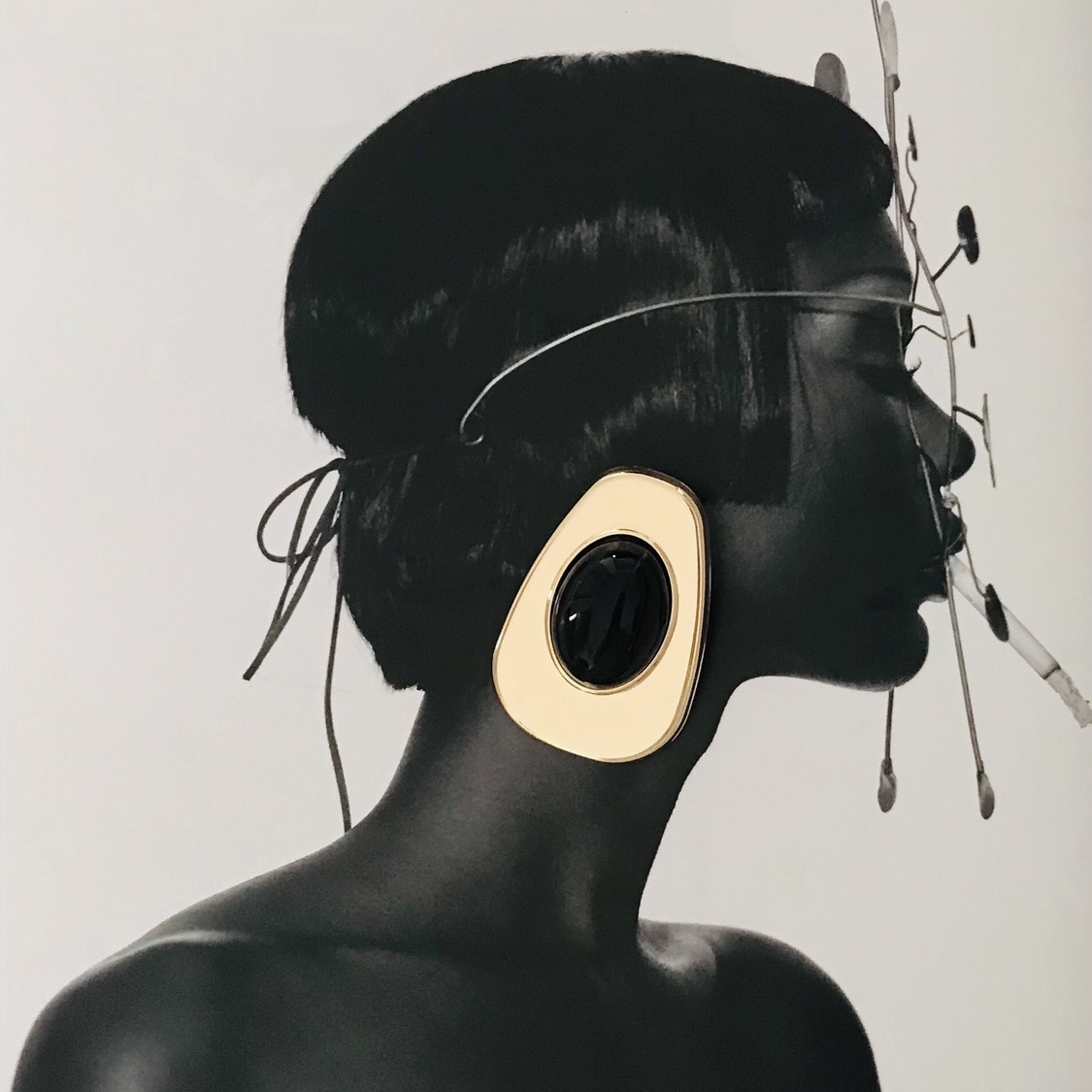 Descrição: Brinco em metal - no formato trapézio, banho ouro 18K. Detalhe ao centro, formato oval ( 3,2cm ), em resina - na cor preta. Fechamento em pino e tarraxa.